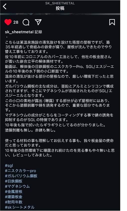 社長: 反響は大きいですよ。ついこの前も某温泉施設の湯気抜けを設けた屋根が築35年経過して骨組みが腐って屋根が沈んできたので葺き替え工事をしたのですが、約7年前に葺いた「ニスクカラーSGL®」の小口が赤錆も無く本当に綺麗で。